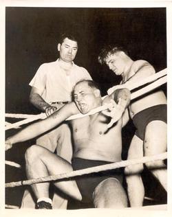 1949 WIREPHOTO... Referee Jack Dempsey watches as wrestler Cowboy Luttrell attempts to throttle opponent Dorve Roche in a June 1940 match. A Dempsey-Luttrell feud supposedly resulted from this event culminating in a July 1940 fight in which Dempsey stopped Luttrell in 2 rounds